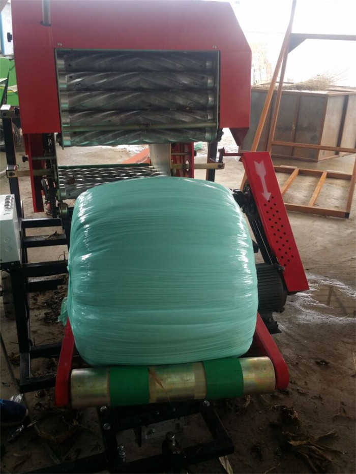 青貯打捆包膜一體機有打捆、包膜兩部分組成,通過機器前部人工給固定倉喂料,當草捆大到固定倉和活動倉接觸到一定密實度時,活動倉上方的惰性輥和左側的信號輪會均勻轉動,操作者板動繞線離合手柄,機器開始往復饒繩捆扎,繞繩一周,麻繩自動切斷,立即開倉放捆,草捆直接落入包膜機的旋轉架上,用手把膜拉出,啟動旋轉按鈕,旋轉架帶動草捆轉動,操作者應同步迅速將膜壓向草捆,并隨著草捆旋轉一周,然后立即松手,牧草膜逐漸逐層包裹在草捆外,草捆自隨著旋轉架公轉,當包膜到設定的層數時,離合器自動脫開,旋轉架停下,操作員在草捆和輸膜架之間把牧草膜切斷,把牧草膜斷頭一端壓入草捆端面重疊處,用一人將包膜好的草捆搬入小推車內,推走擺放整齊。