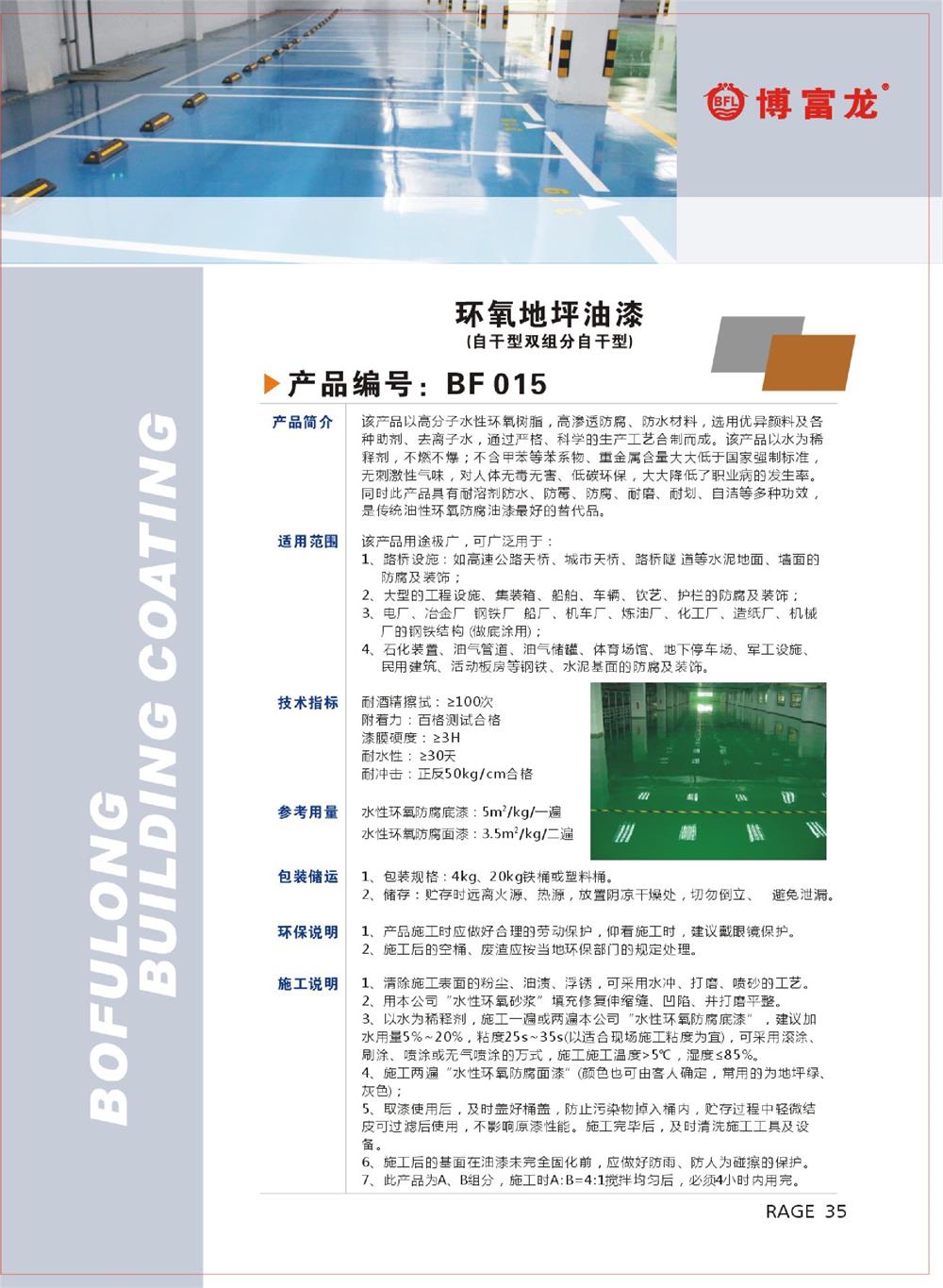 該產品以高分子水性環氧樹脂,高滲透防腐,防水材料,選用優異顏料及各種助劑、去離子水,通過科學的生產工藝合制而成,以水稀釋劑,不燃不爆,不含甲苯等苯系物,無刺激性氣味,低碳環保。博富龍經過多年的穩健發展和實踐經驗 , 已建立了完善的產品研發體系。質量管理體系,產品制造體系,是一家墻體復合材料的專業廠家。主要經營博富龍,產品包括環保建筑涂料和內外墻膩子粉、外墻外保溫材料、彩色砂漿、瓷磚膠、填縫料、防水材料、自流平、修補砂漿等。致力于高科技環保建筑涂料的研發、制造、銷售和服務。szfuantai.cn服務項目:1、水性環保復合材料的開發與銷售。2、建筑物表面裝飾、維修、保護工程的施工。3、特殊基面、l日基面的涂裝診斷,分析。