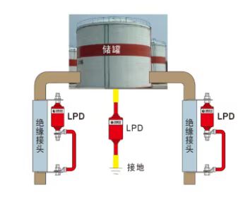 因為儲罐內(nèi)外壁實施了陰極保護(hù),導(dǎo)致儲罐的接地成為陰極保護(hù)的一個電流故障點。因為接地體一般采用鋅鍍材料的原因,在初始用時接地對陰極保護(hù)的影響很小,但隨著接地材料在地下使用的原因,鋅鍍會在一兩年內(nèi)損耗掉,從而導(dǎo)致陰極保護(hù)電流流失,影響陰極保護(hù)系統(tǒng)的正常運行。將LPD-100/1000型火花間隙串聯(lián)在接地線之間,正常情況下,該產(chǎn)品處于完全絕緣的狀態(tài),儲罐的陰極保護(hù)電流不會通過接地線流失。在遭受雷電時,該產(chǎn)品瞬間導(dǎo)通,將雷電流通過接地線泄放入地。