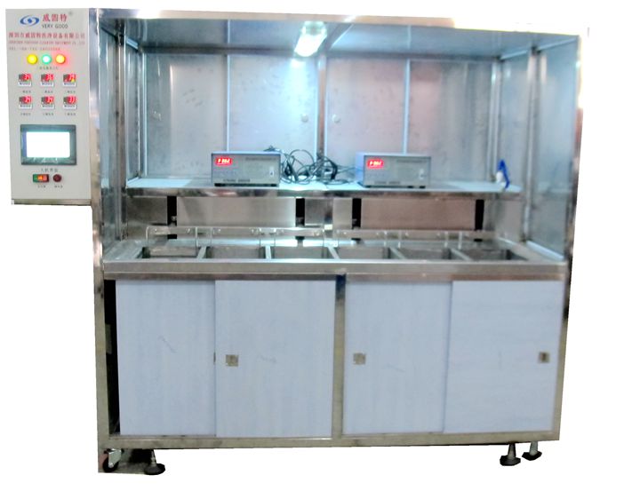 威固特為石英玻璃超聲波清洗機設計了一道清洗工藝流程,為:超聲波溶劑清洗→超聲波溶劑清洗→滴空槽→超聲波水溶劑清洗→超聲波水溶劑清洗→純水噴淋漂洗→超聲波熱純水漂洗→超聲波熱純水漂洗→超聲熱純水漂洗→超聲波熱純水漂洗→⑾熱純水慢拉脫水(提籃方式:手動)