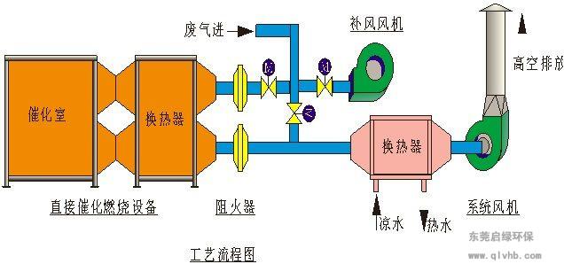 催化燃燒裝置主要由熱交換器、燃燒室、催化反應(yīng)器、熱回收系統(tǒng)和凈化煙氣的排放煙囪等部分組成,如右圖所示。其凈化原理是:未凈化氣體在進(jìn)入燃燒室以前,先經(jīng)過(guò)熱交換器被預(yù)熱后送至燃燒室,在燃燒室內(nèi)達(dá)到所要求的反應(yīng)溫度,氧化反應(yīng)在催化反應(yīng)器中進(jìn)行,凈化后煙氣經(jīng)熱交換器釋放出部分熱量,再由煙囪排入大氣。