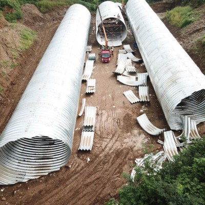 鋼波紋管涵從材料與結構和功能的本質關系,析,采用柔性高強度的鋼波紋管涵洞由于軸向波紋的存在,使其具有優良的受力特征,軸向和徑向同時分布因荷載引起的應力應變,可以更大程度,散荷載的應力集中,更好地發揮鋼結構的優勢。鋼波紋管涵具有施工工期短、重量輕、安裝方便、耐久性能好、工程造價低、抗變形能力強、減少養護費用成本等優點。