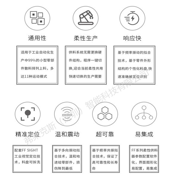 弗萊克斯(深圳)智能科技有限公司的柔性振動盤,結合智能CCD定位系統和機器人抓取系統,可以解決傳統振動盤解決不了的薄片類、易刮擦損傷類、異形工件上料的痛點問題,更契合當前自動化中的小批量、多品種的柔性生產需要,一鍵切換產品生產,弗萊克斯將繼續探索前沿,以有效智能方案,推動行業發展,助力工業智能制造,希望我們的技術與服務能幫助您的事業發展。