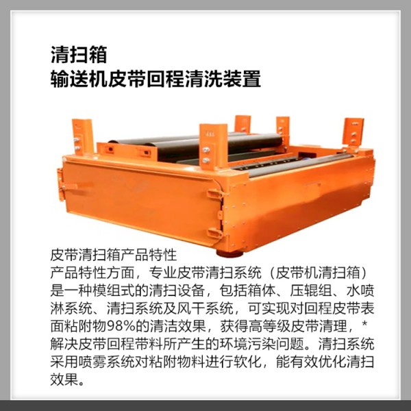 智能皮帶清掃箱主要系統有箱體,多級刮板,刷輪、傳動組件以及風刀、微動力除塵器、電控箱等組成。