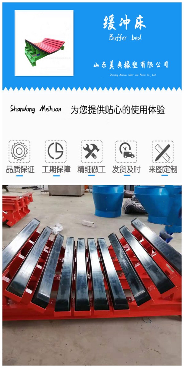 緩沖床利用自身的彈性對物料下落到皮帶上的沖擊力進行處理,使沖擊力達到zui小。這種設計可以有效防止由托輥斷裂、脫落造成的皮帶縱向撕裂,同時大大降低了皮帶被鐵器或尖銳物料穿透后導致輸送帶撕裂的概率。緩沖床的耐磨體通常采用UHMW(超高密度聚乙烯)制成,具有超高的抗沖擊強度和自潤滑性能。
