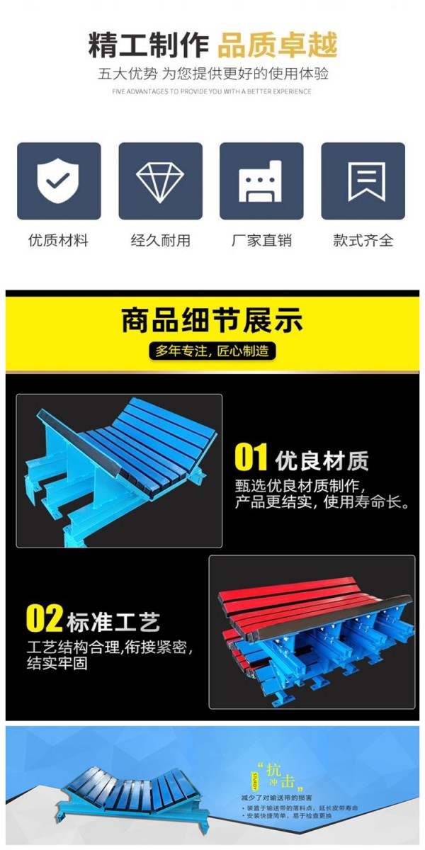 綜上所述,緩沖床是皮帶輸送機系統中的一部分,它通過減少物料下落時的沖擊力,保護皮帶,延長使用壽命,并確保系統的穩定運行。不同的緩沖床類型和設計可以滿足各種不同的使用環境和需求。