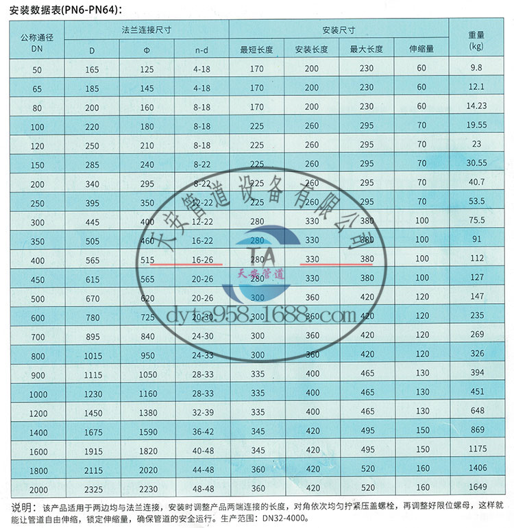 該產(chǎn)品適用于兩邊均與法蘭連接,安裝時(shí)調(diào)整產(chǎn)品兩端連接的長度,對(duì)角依次擰緊壓蓋螺栓,再調(diào)整好限位螺母,這樣就能讓管道自由伸縮,鎖定伸縮量,確保管道的安全運(yùn)行。
