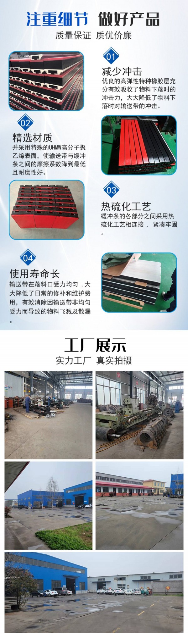 緩沖條上的白板具有較低的摩擦系數,滑動運行阻力很小。具有很高的耐磨性,經久耐用,具有較高的抗拉強度和抗沖擊強度。黑板富有彈性和柔韌性,能很好的吸收沖擊能量,極大的減輕物料下落時對皮帶的沖擊。山東美奐橡塑