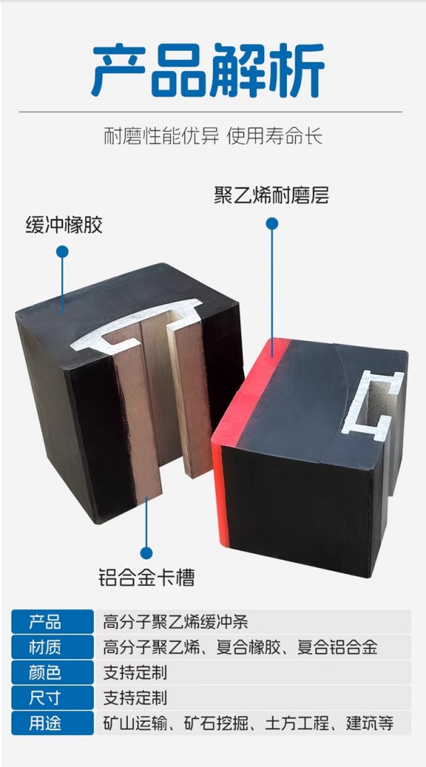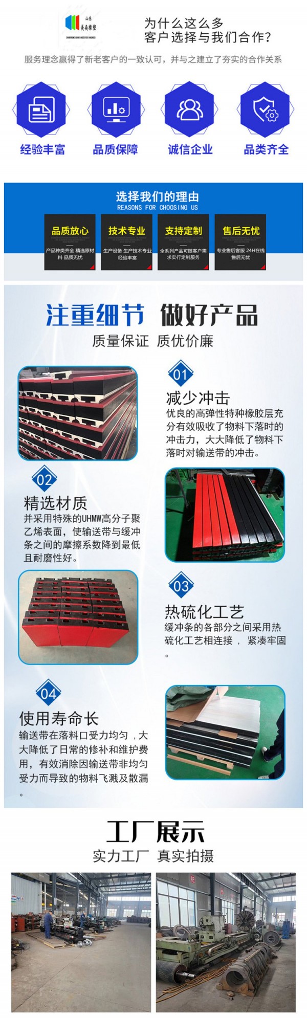 緩沖條是由橡膠、金屬型材 (鋼件或鋁型材)、超高板材按同一 種結構方式粘合為一體的組合件。由多件緩沖條和其它結構件組合成緩沖床,用于皮帶輸送機進料口 緩沖接料,替代傳統的緩沖托輥,高能吸收和低摩擦地緩解進料端落料的沖擊力。為廣大火電廠、玻 璃廠、煉鋼廠、港口碼頭、水泥、礦山等的皮帶輸送系統提供良好的緩沖環保設備。