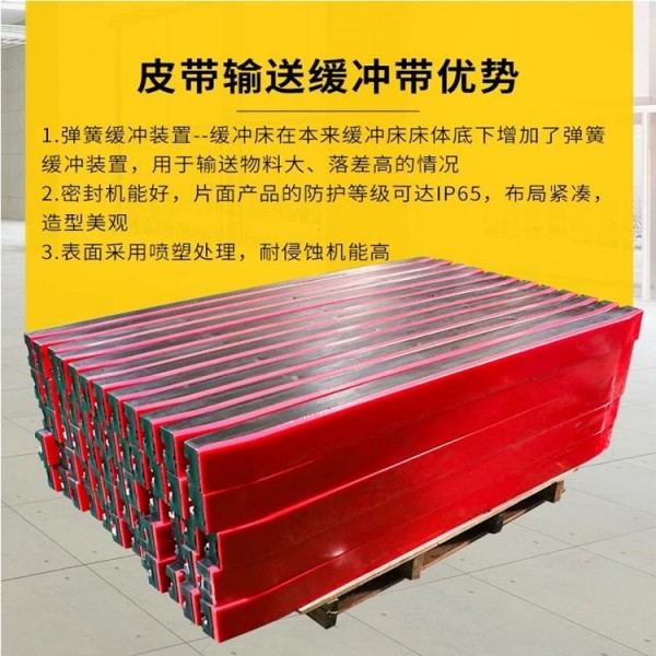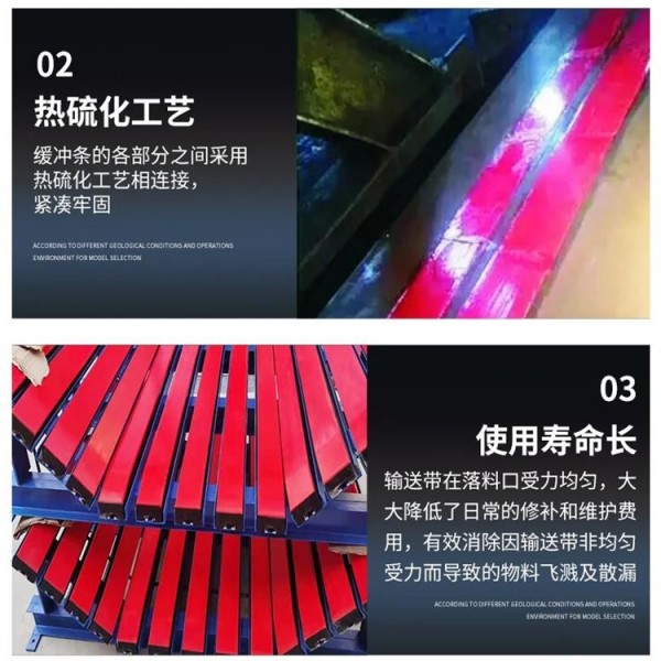 緩沖條是用于輸送機(jī)的進(jìn)料口處,替代傳統(tǒng)的緩沖托輥,高能吸收和低摩擦地緩解進(jìn)料端落料的沖擊力,輸送條和輸送帶的面接觸有效防止了對(duì)輸送帶的損傷。