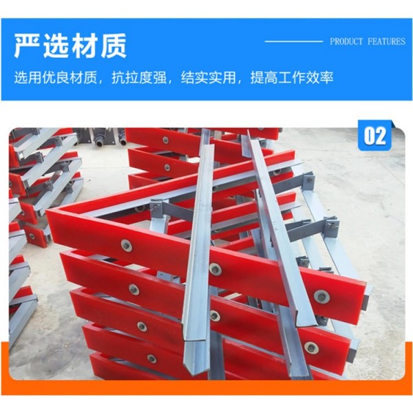 清掃器刮板采用聚氨酯高分子材料制作,具有阻燃抗靜電性、高耐磨性、高彈性、耐酸堿性、摩擦系數(shù)低等特點,不會對輸送帶造成損傷,使用壽命長。