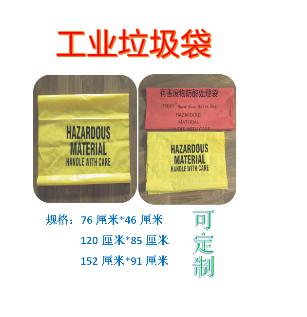 防化垃圾袋,又稱為“有害廢物垃圾袋”、“有害廢物處理袋”。英文名稱為 “Hazardous Waste Bags”、 “Hazardous Material waste bags”、“Hazardous Material Disposal Bags”。材質厚度顏色編輯一般為堅韌的聚乙烯材質,少數也有PP聚丙烯材質的。單面的厚度一般在8絲。當然,也可依據實際 需要,做得比8絲更厚。顏色一般為黃色,這樣就更顯眼,更易識別。袋子上一般印有“有害廢物”的警示的內容或者“小心處理”的警示內容。 Carries bold "Caution Handle With Care" reminder。